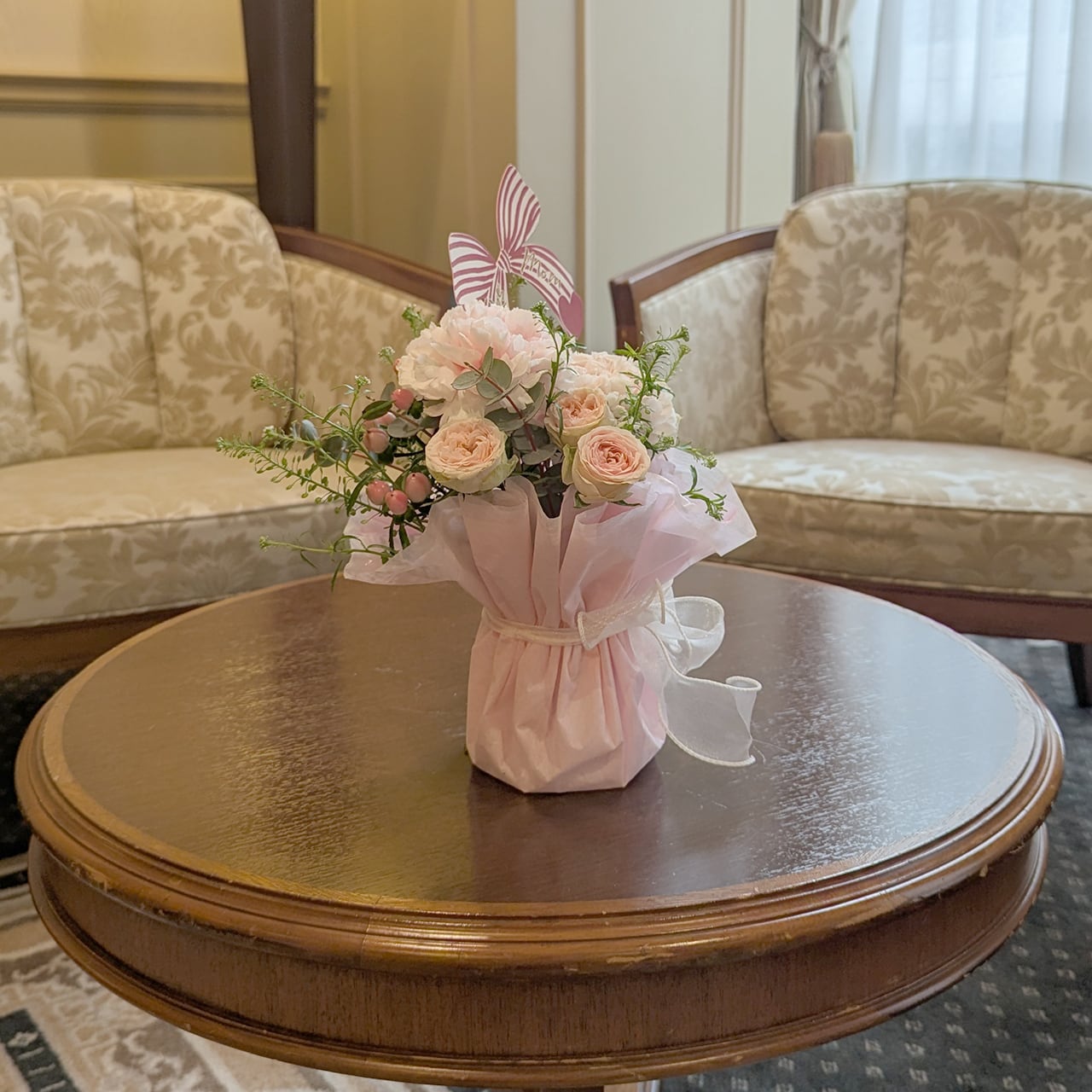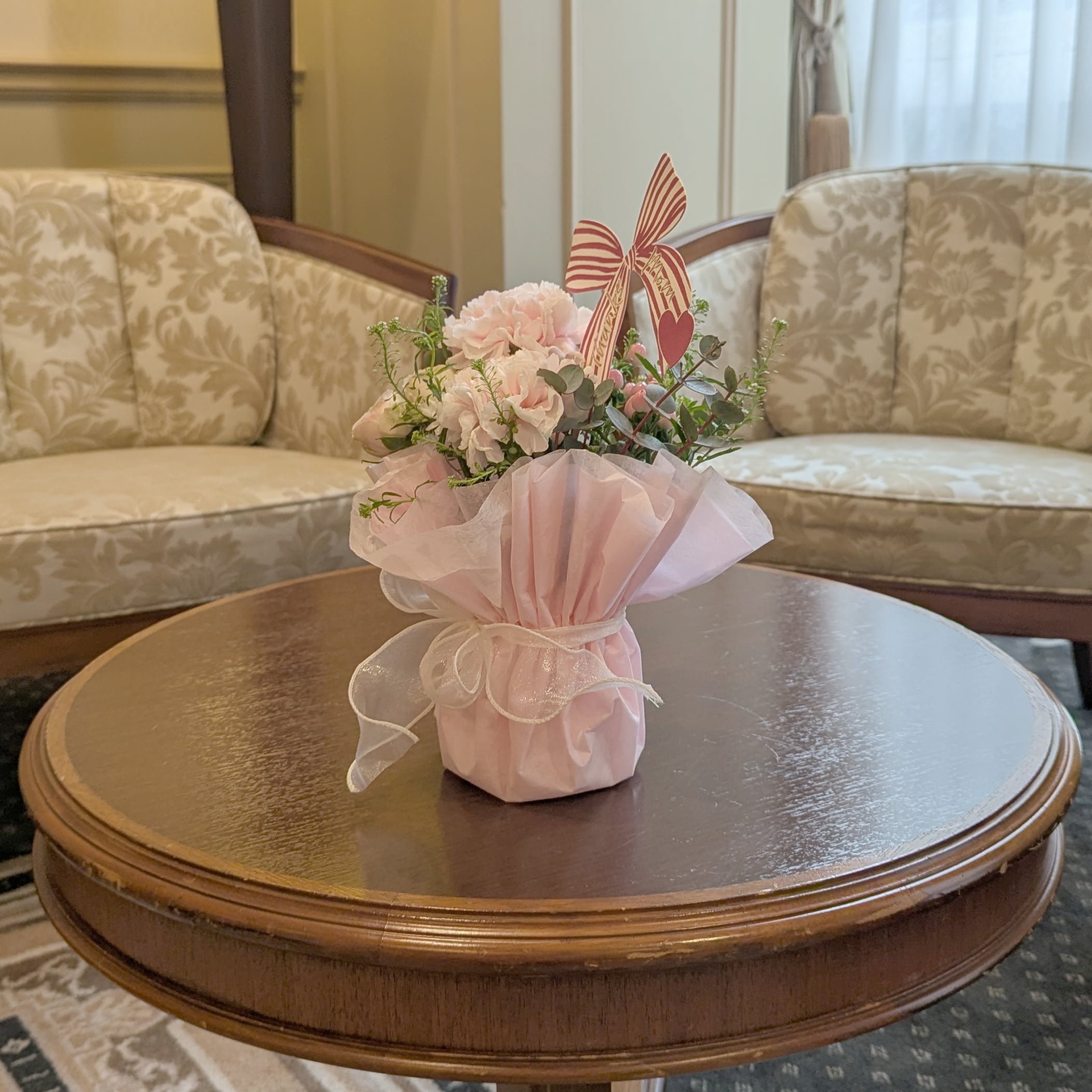 優しいピンク色のカーネーションを使ったフローリスト三芳園オリジナルのスタンディングブーケです。