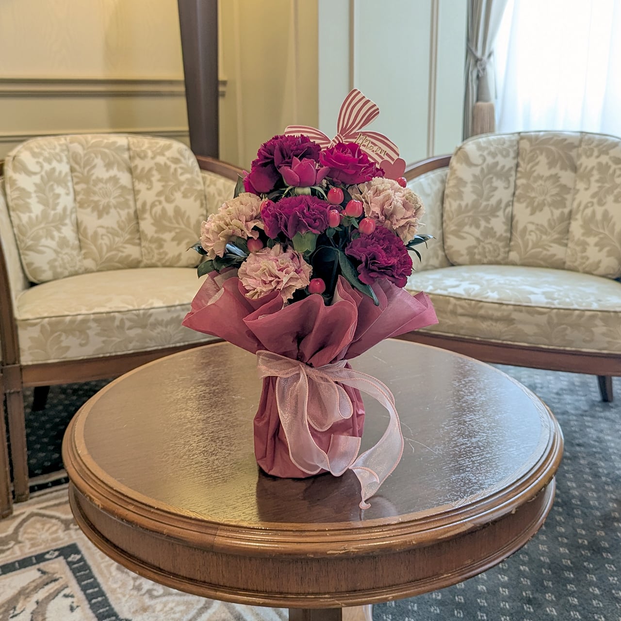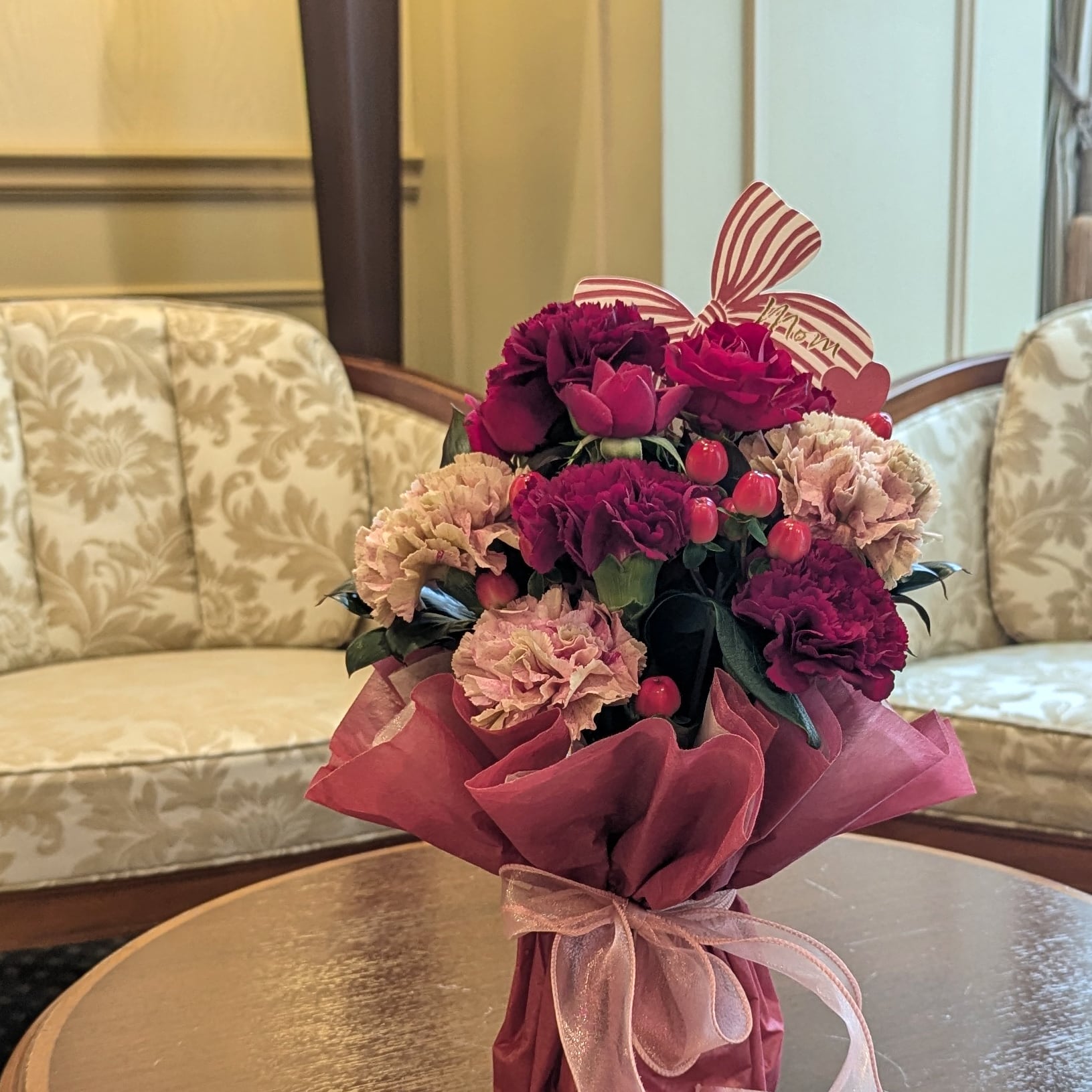 ワインレッドのカーネーションを使った落ち着いた色合いのブーケにリボン型のカードをお付けしてお届けします。