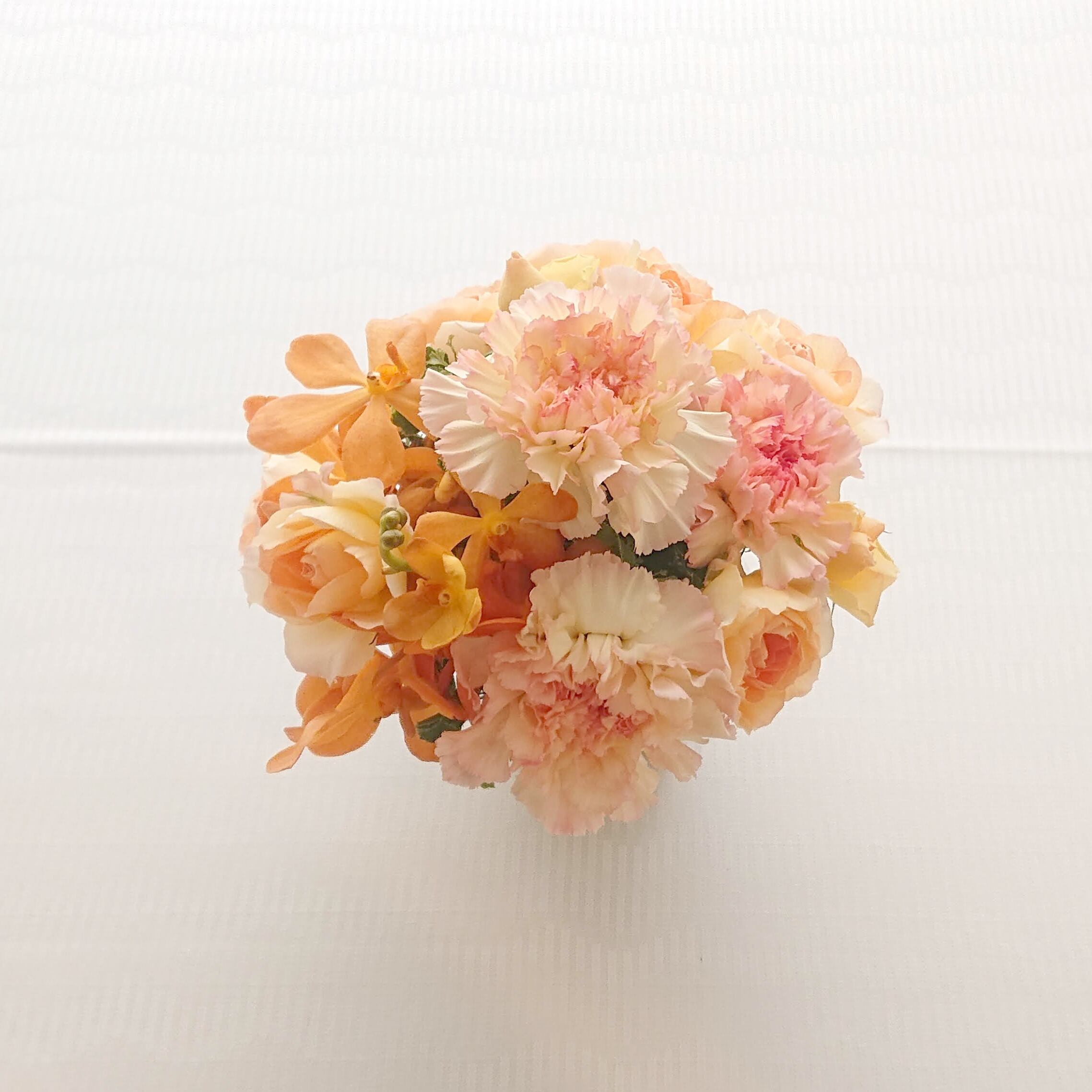 オレンジのカーネーションを中心にオレンジの花を集めたアレンジメントです。