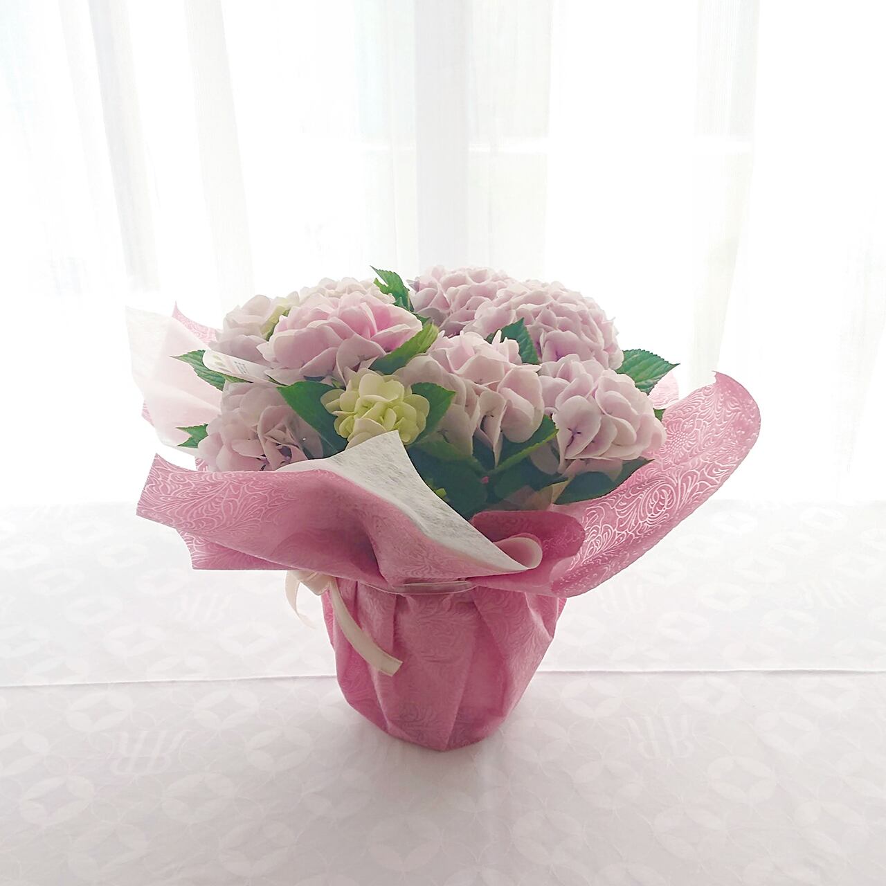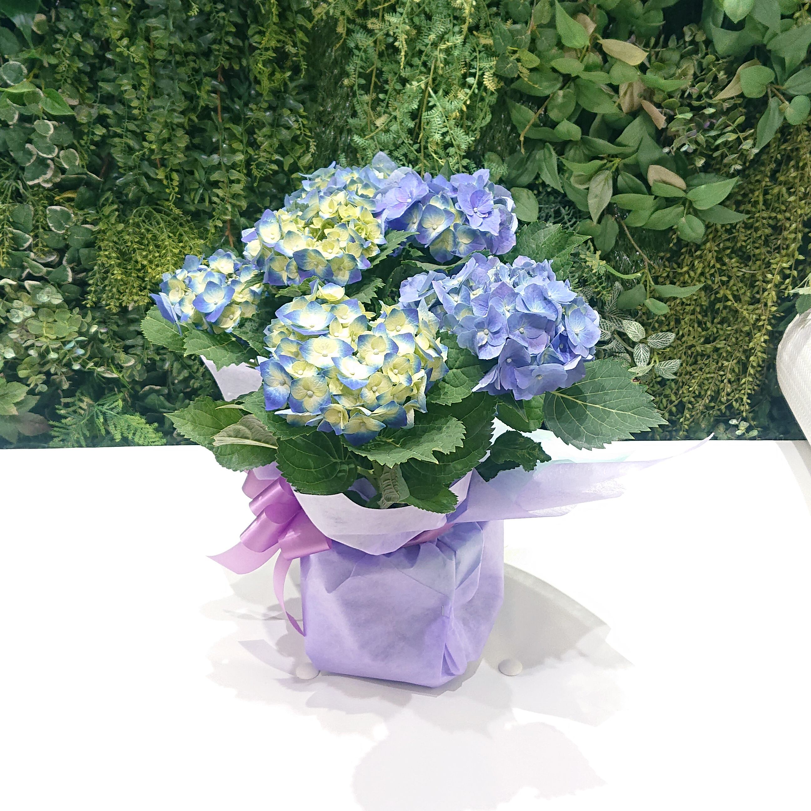 人気の紫陽花 5号鉢をラッピングしてお届けします。