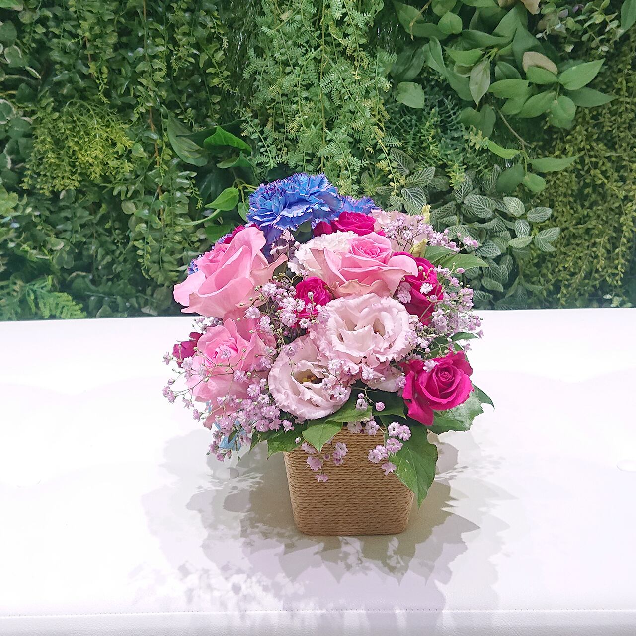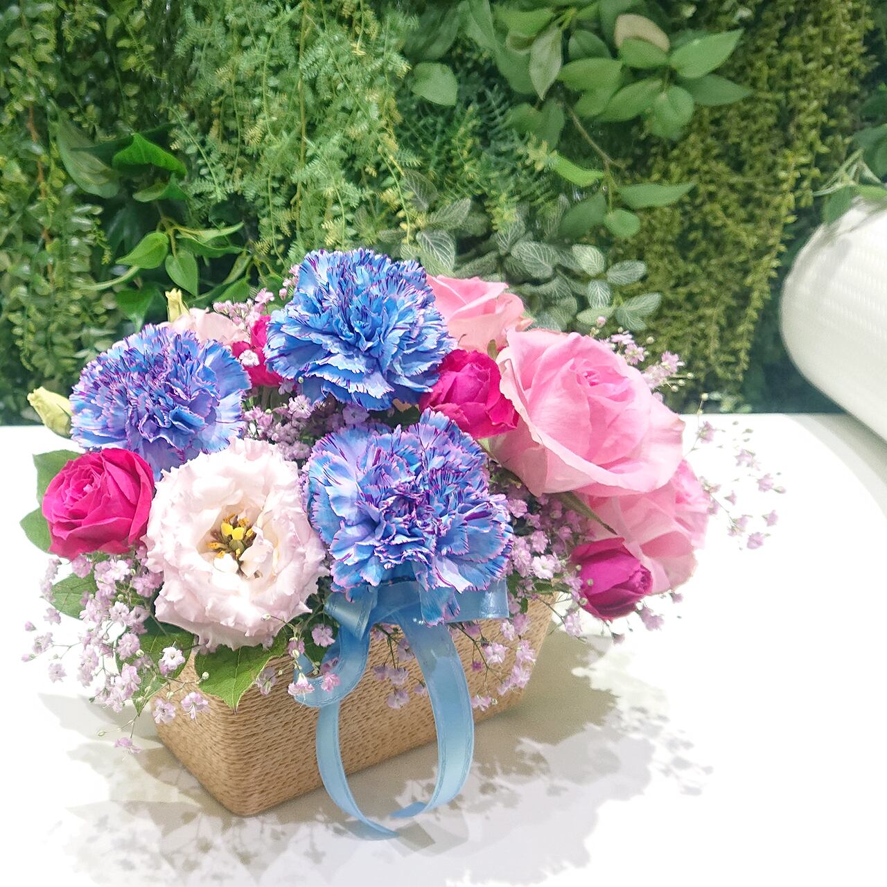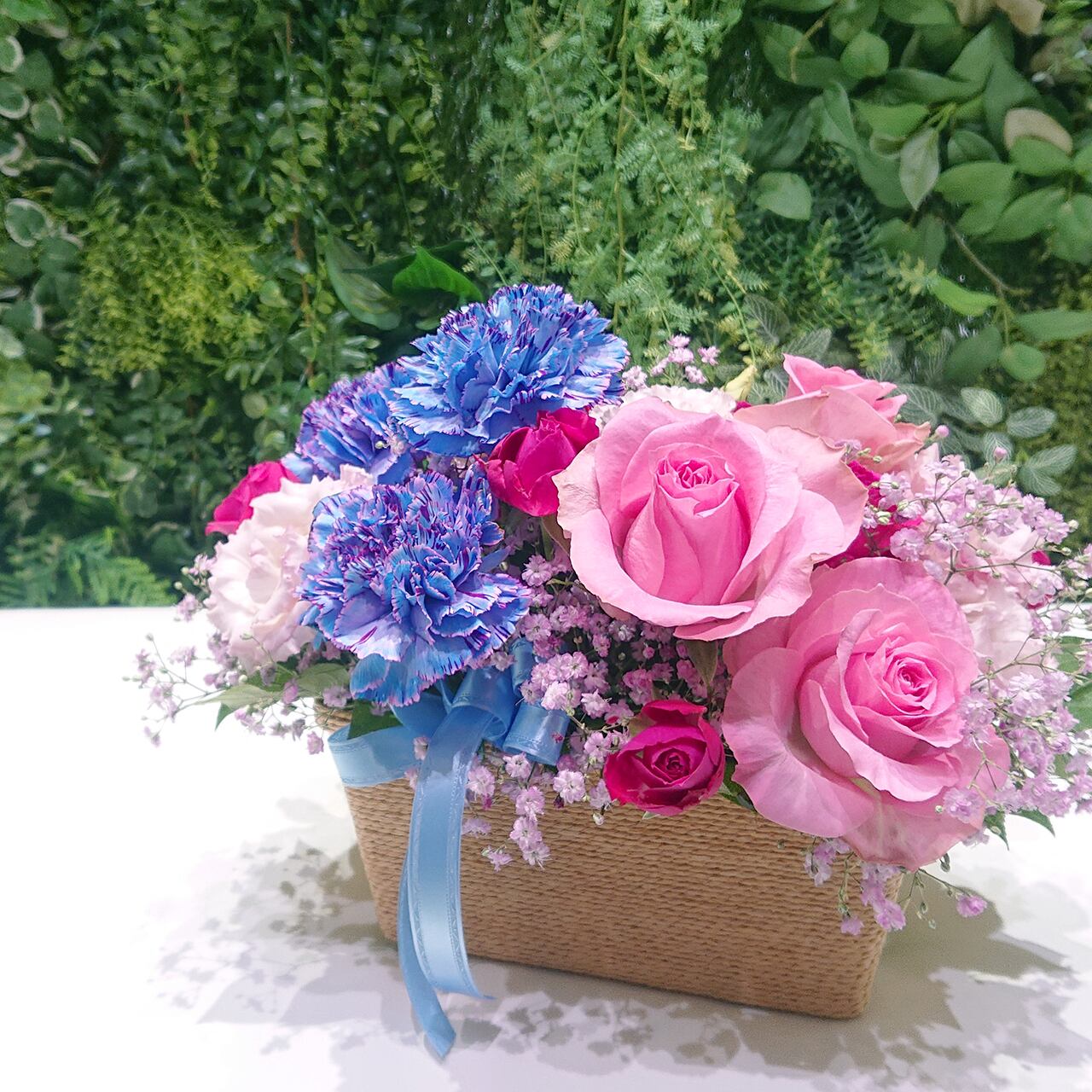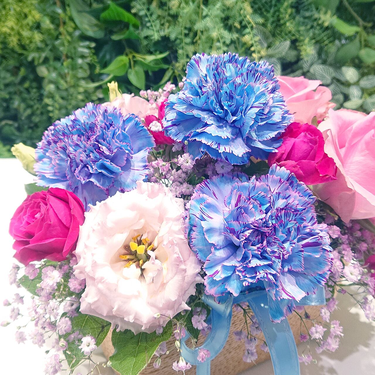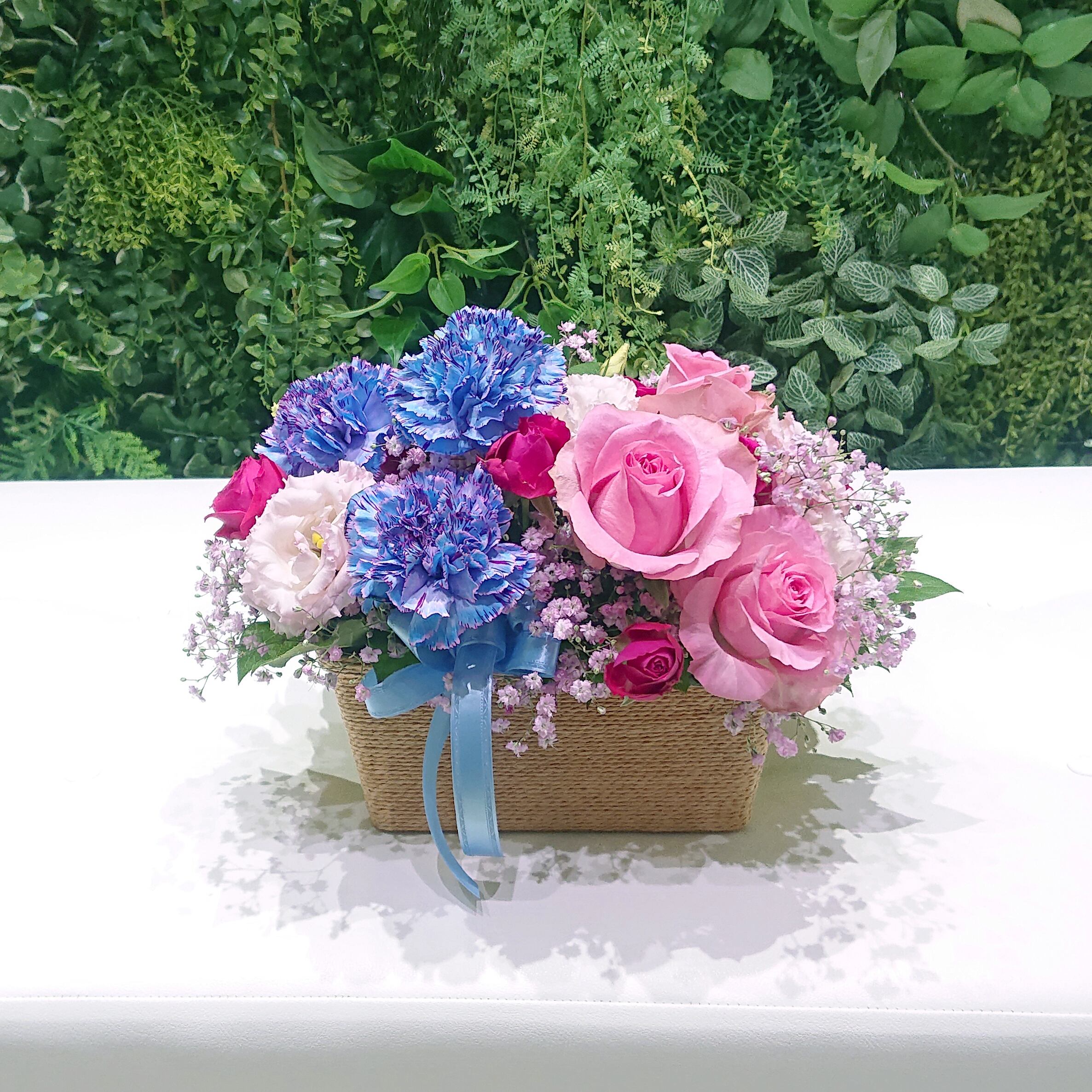 ブルー・ピンクの染めカーネーションとピンクのバラのアレンジメント
