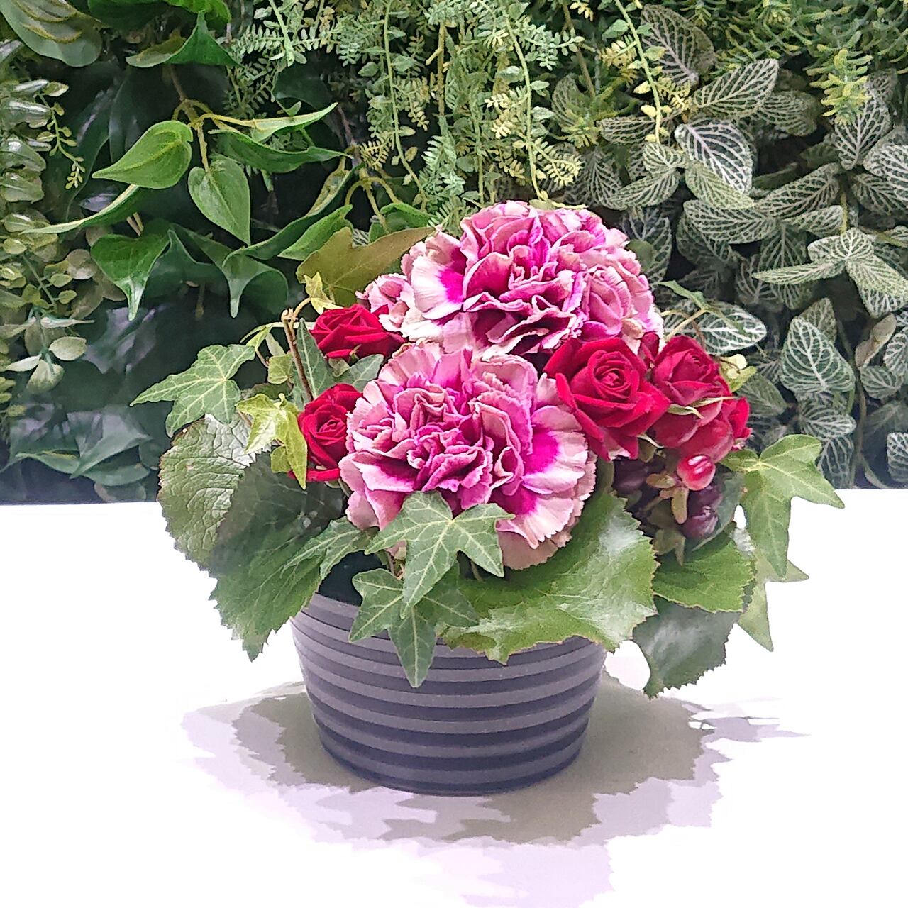 紫色~ピンク色への複色のカーネーションを使用したアレンジメントです。