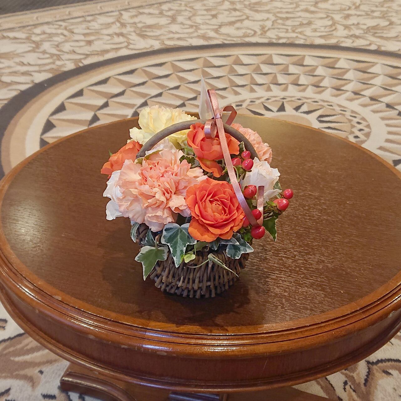 オレンジのカーネーションにミニバラをあしらったフローリスト三芳園オリジナルのビタミンカラーのバスケットアレンジです。