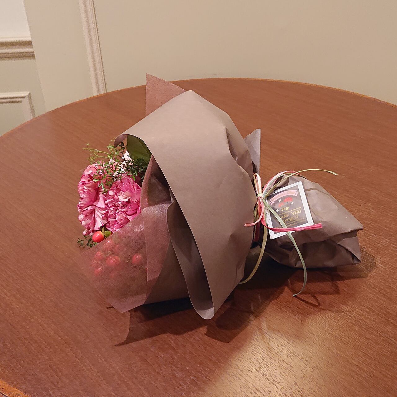茶系のペーパーでラッピングした落ち着いた色合いのブーケは、スタイリッシュなブーケです。