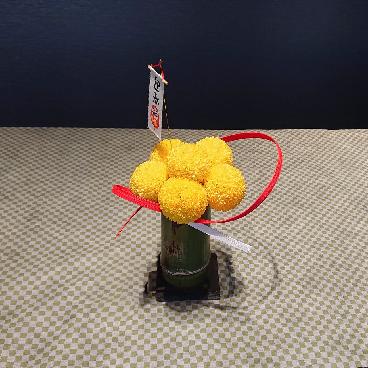 本物の竹の器にピンポンマムの黄色をアレンジしました。